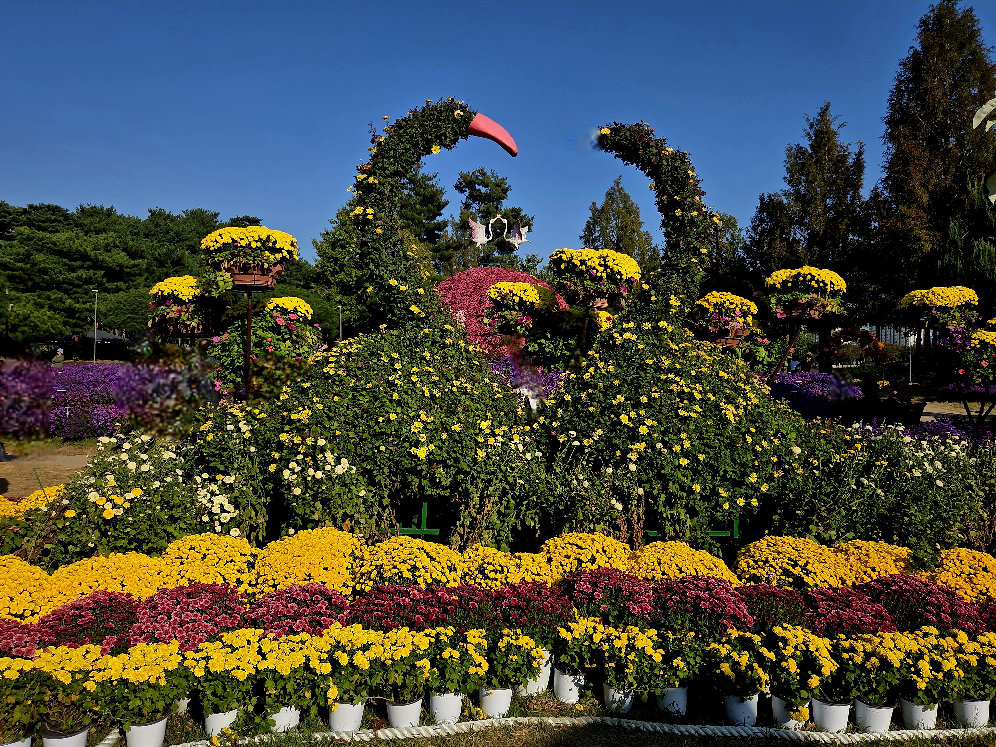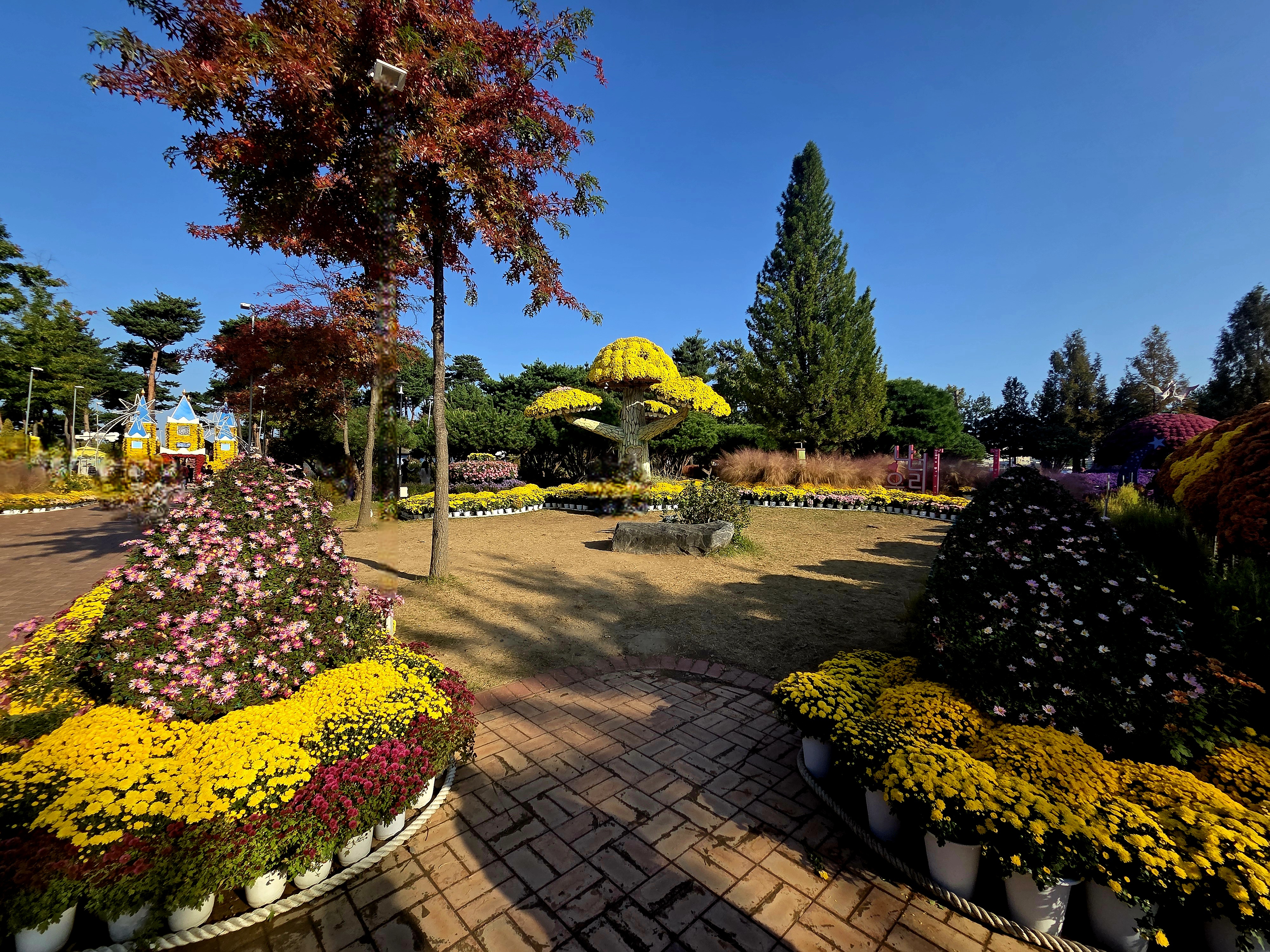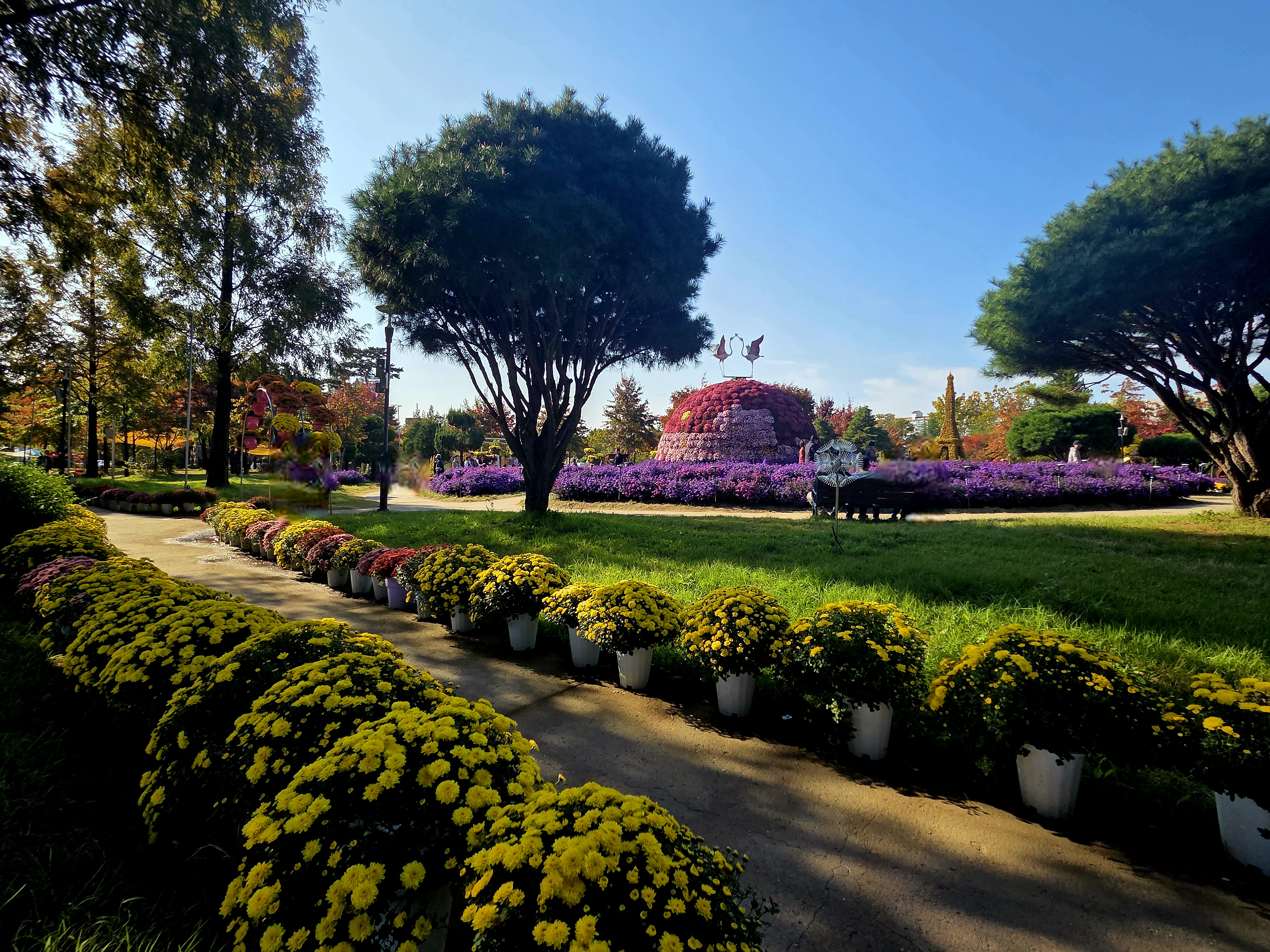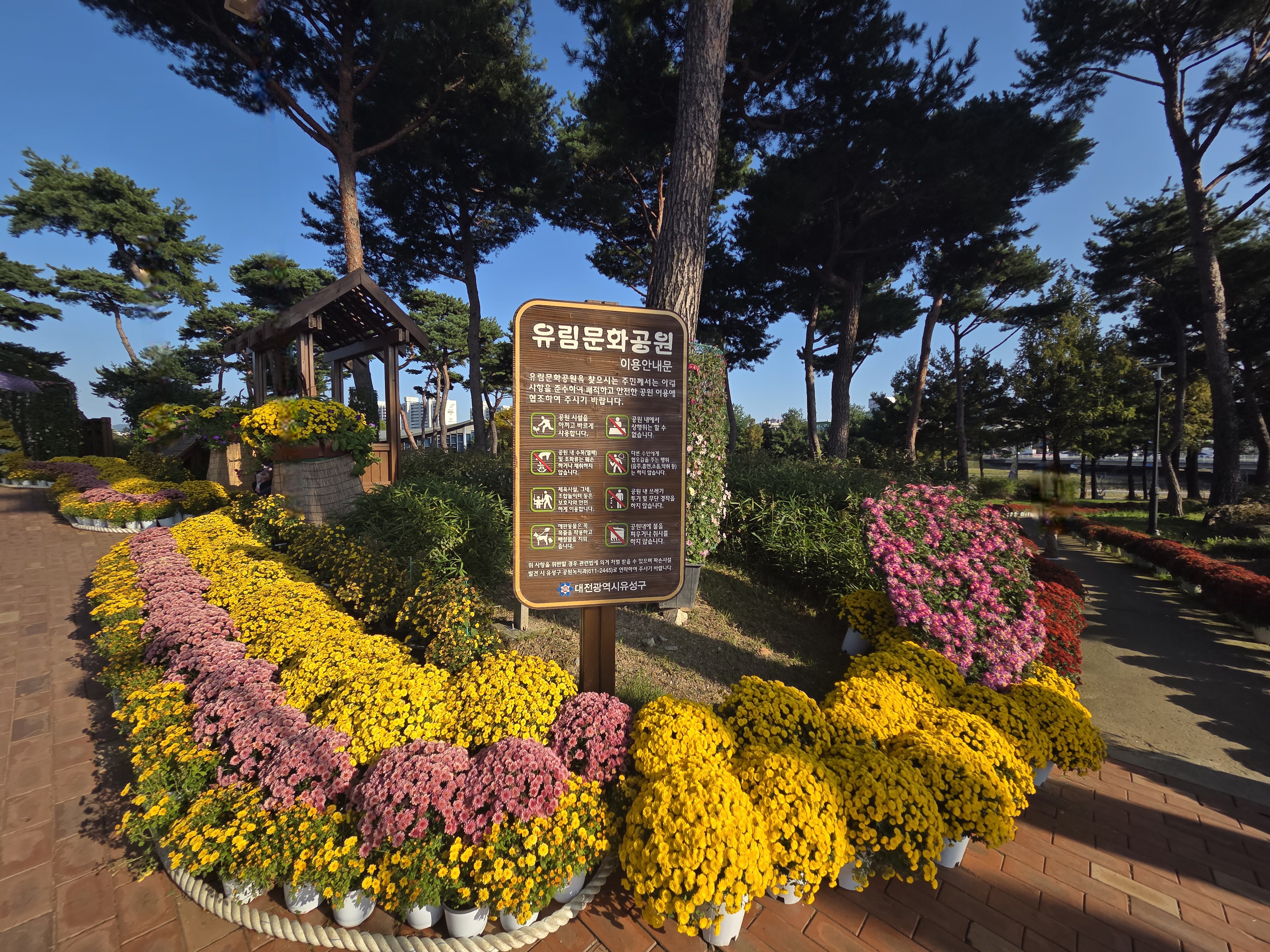 유림공원은 대전시 유성구 어은동에 있는 공원으로 유성구청 앞 갑천과 유성천 부근에 위치해 있습니다. 유림공원은 계룡건설 이인구 명예 회장의 희수 기념 사회환원사업 100억 원으로 만들어졌고 2년의 기간 동안 조성되었으며 명예회장의 아호인 '유림'을 따서 지어졌으며 2009년 6월 28일 개장했습니다. 유림공원 국화향기 가을 축제는 2012년에 처음 성공적으로 개최되어 해마다 규모가 확대되어 3천만 송이가 넘는 국화가 전시되고 있다고 합니다. 공원 내에는 문학마을도서관 , 연못 반도지 등이 위치해 있고 매년 유성 국화 축제를 개최하고 있습니다. 제가 방문했을 때에는 수 천 송이의 국화가 아직 꽃망울을 맺고 있었는데 이 꽃망울이 피어나면 더욱더 아름다울 것 같습니다. 공원에는 어린이들이 좋아할 만한 귀여운 동물 캐릭터들도 있고 알록달록 예쁜 조각들을 아기자기하게 꾸며 놓았으며 그네와 벤치도 곳곳에 있어 대전 시민들이 가족단위로 많이 찾고 있는 공원입니다.