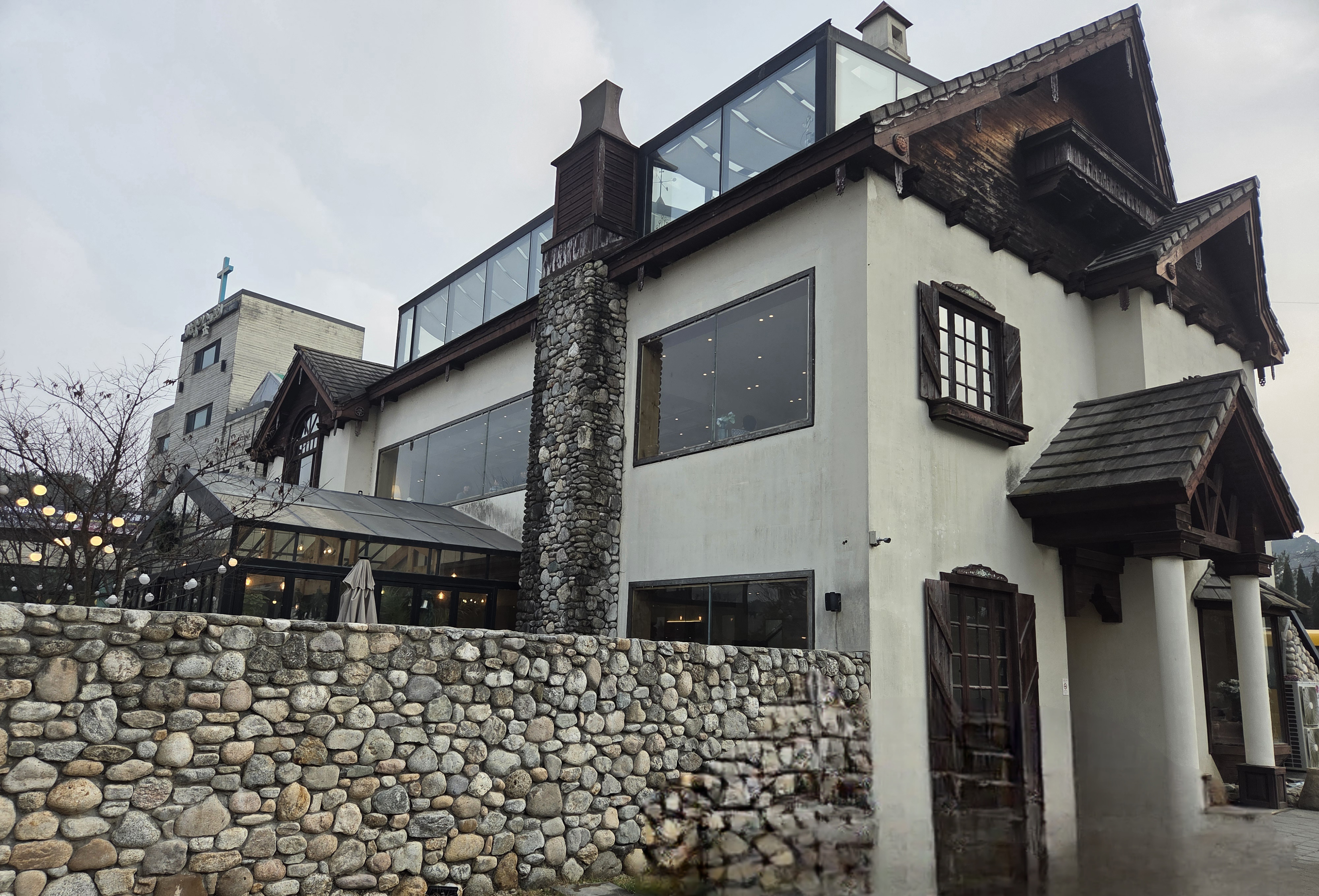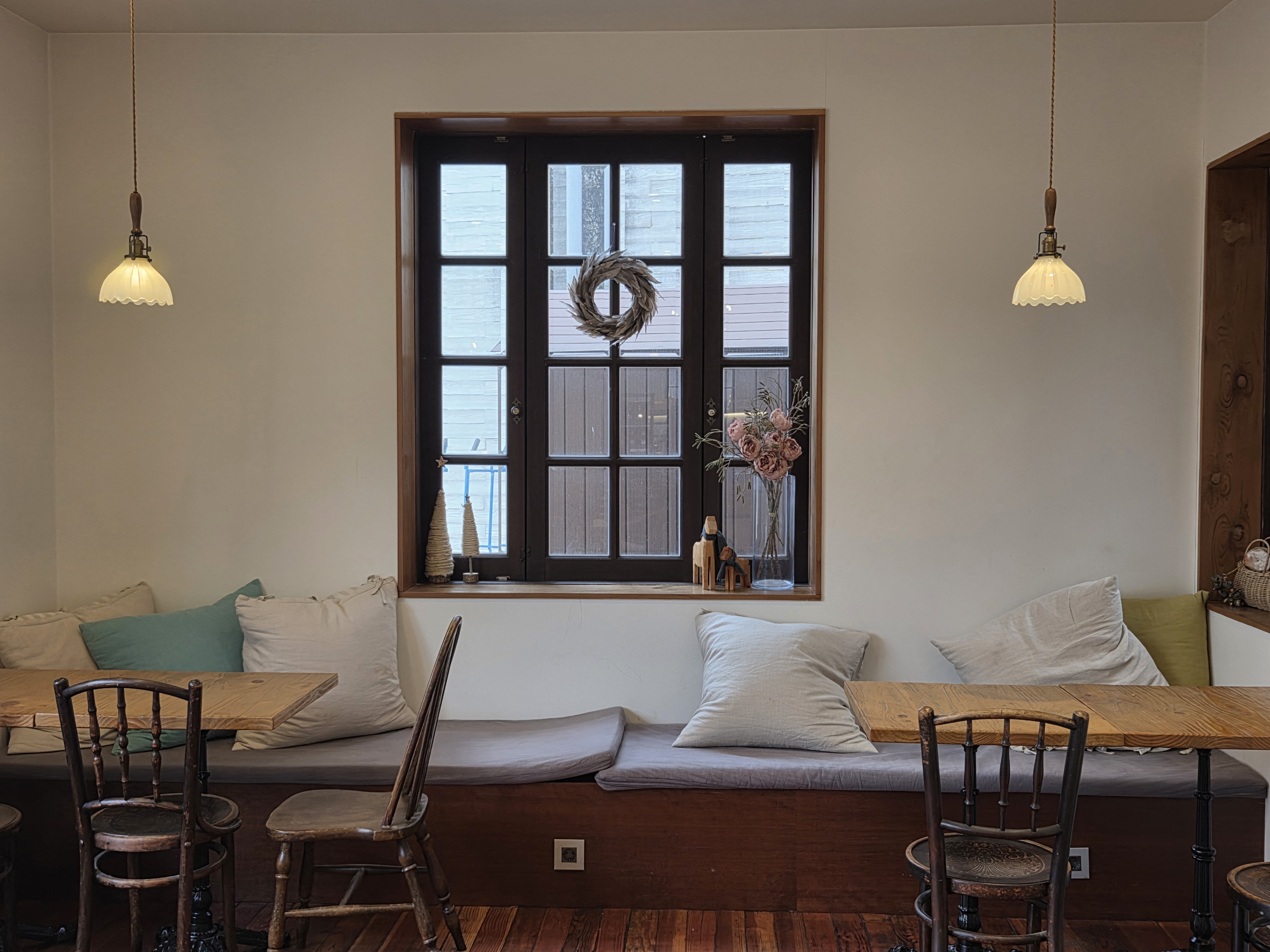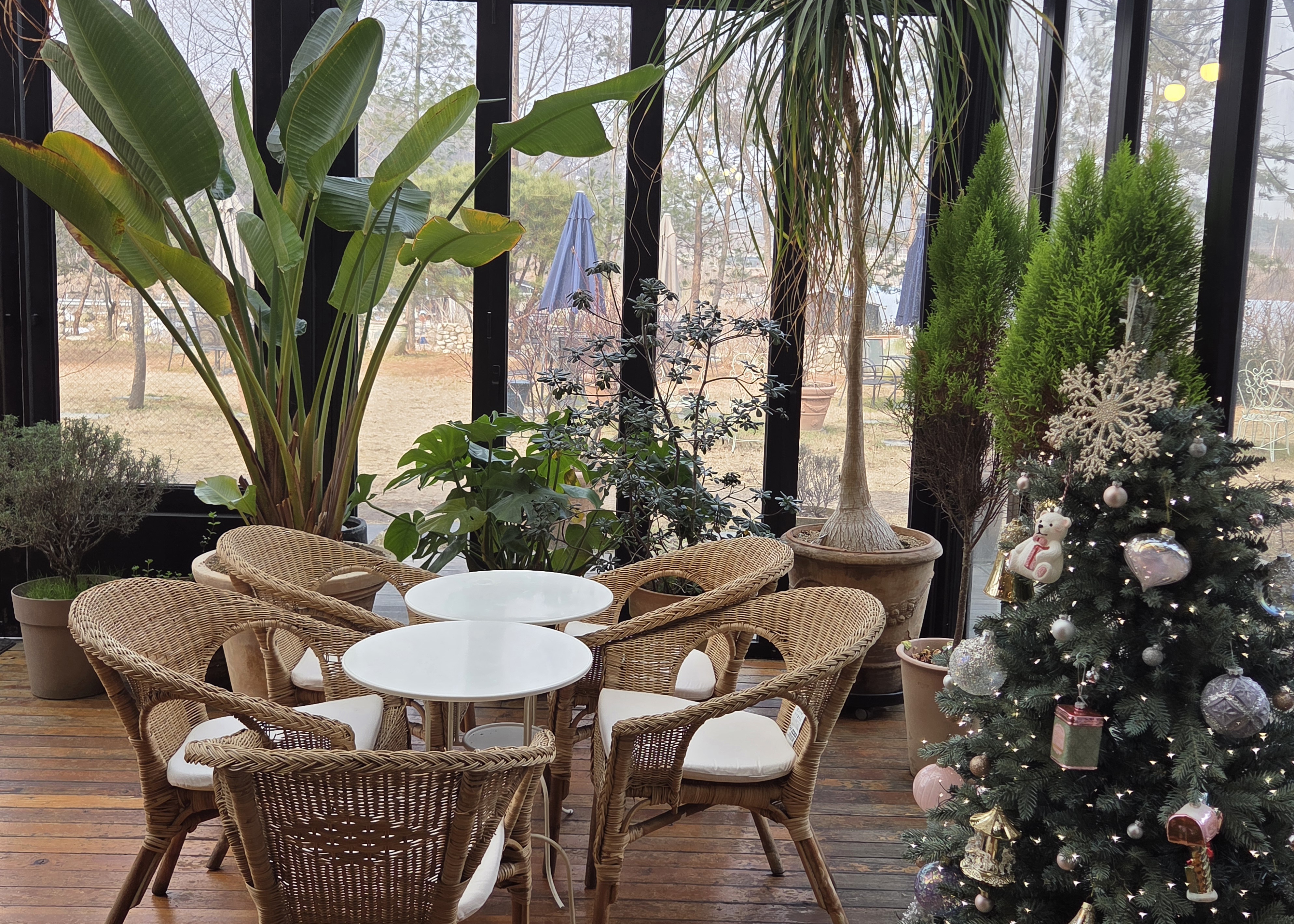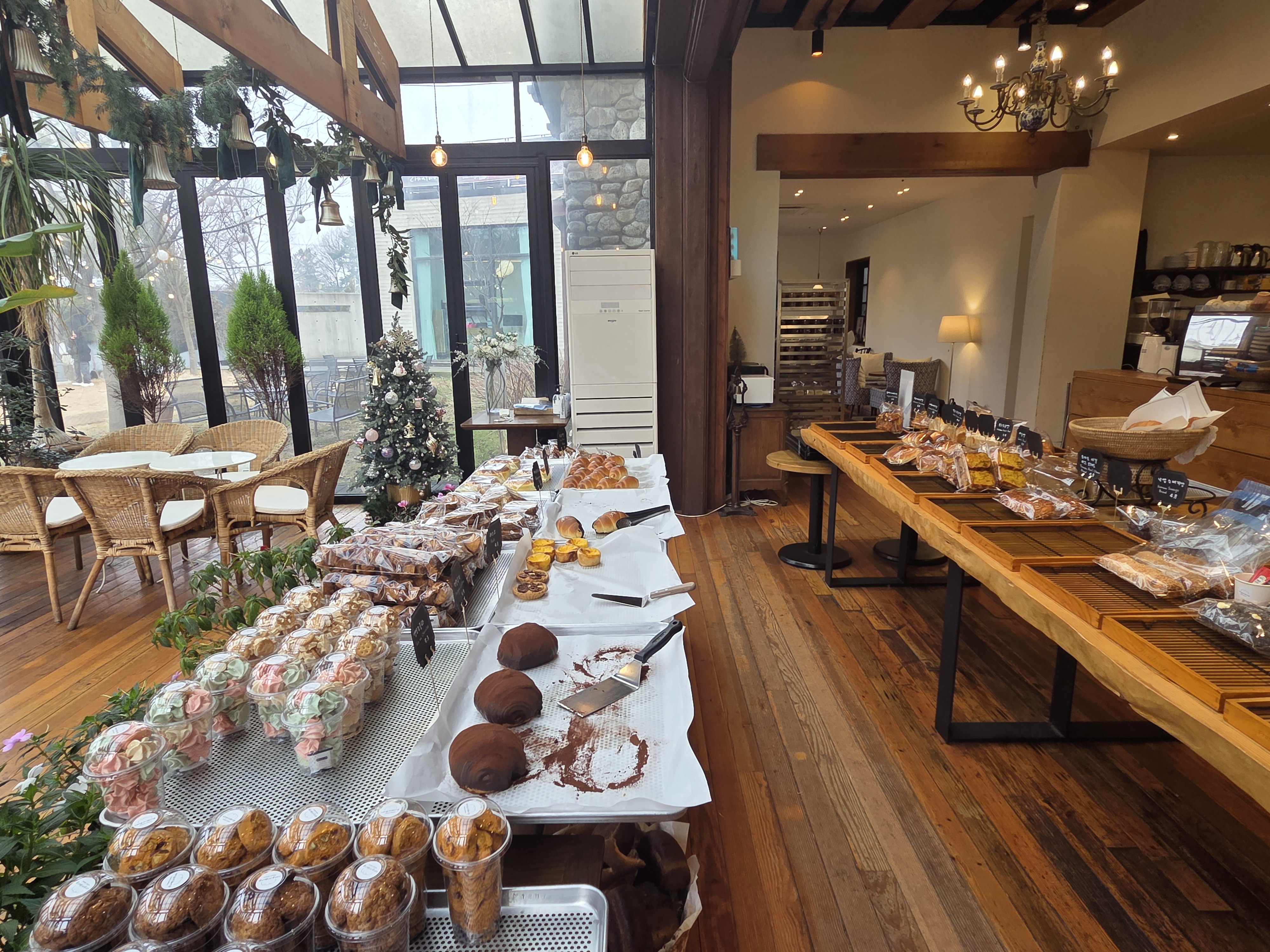 대형 크리스마스 트리가 멋지게 꾸며진 분위기가 좋은 카페로 한 켠에는 아이들이